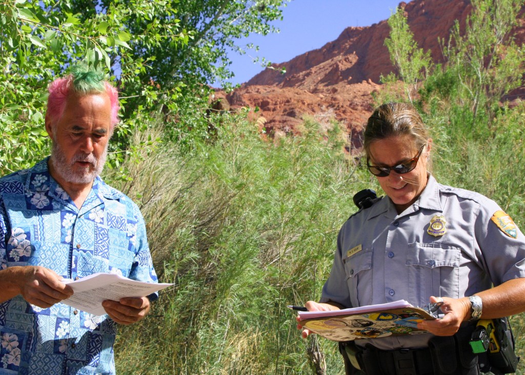 Tom, with his interesting hairdo, and Ranger Peggy check their lists to see which of the many rules they have forgotten to inform us about.