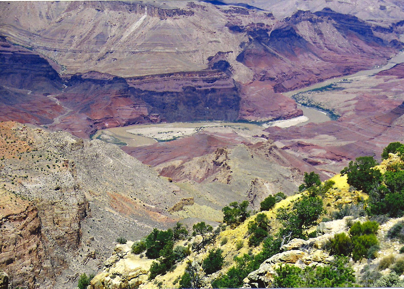 Looking down from Lipan Point at the start of the Tanner Trail. The sharp bend in the Colorado River… far away, is where I am heading. (The photos of the trail down I actually took several years later when I backpacked in with Peggy.)
