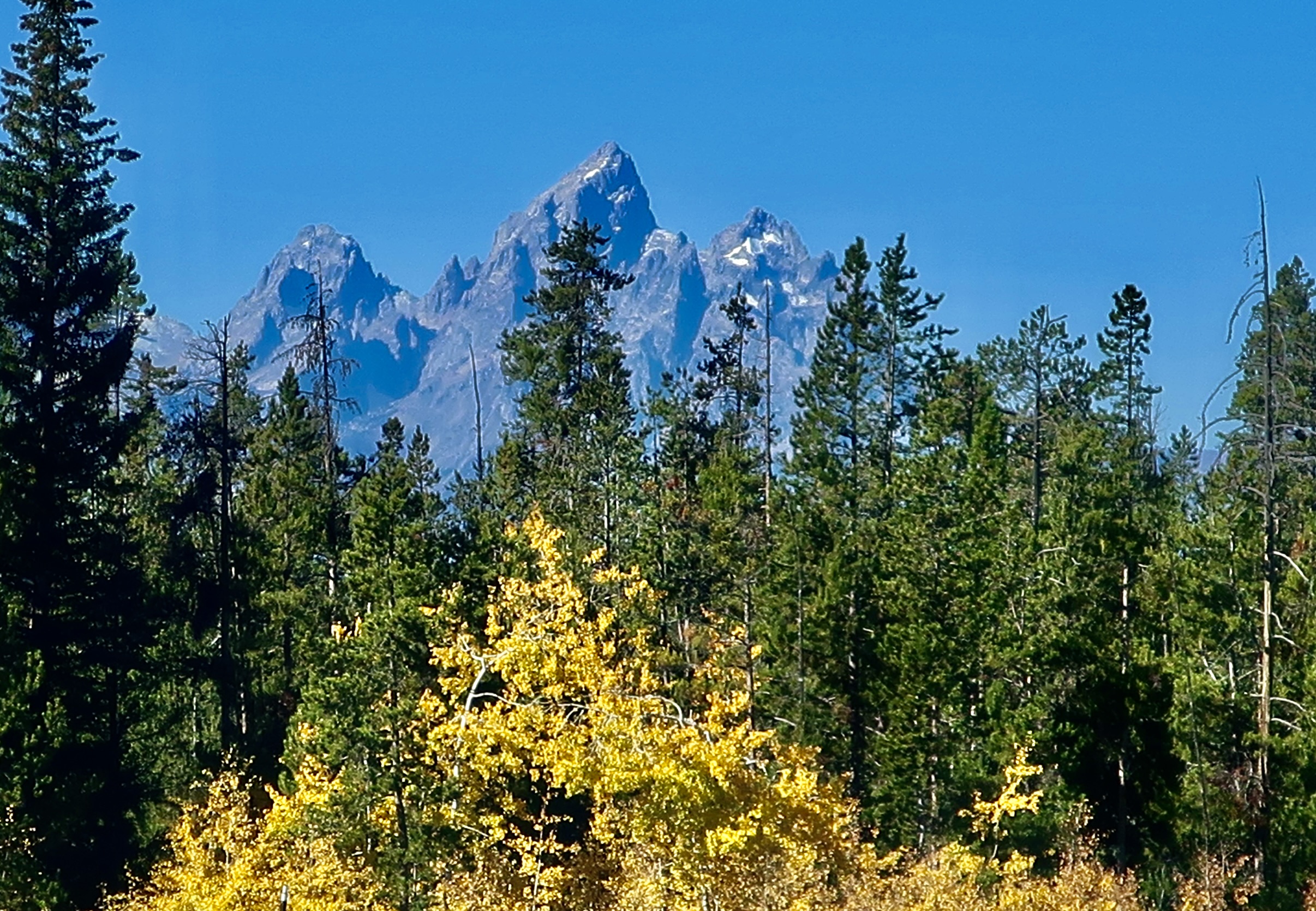 Aspens were soon adding larger splashes of color. The high peak in the center is Grand Teton, after which the range is named. It has an elevation of 13, 775 feet.