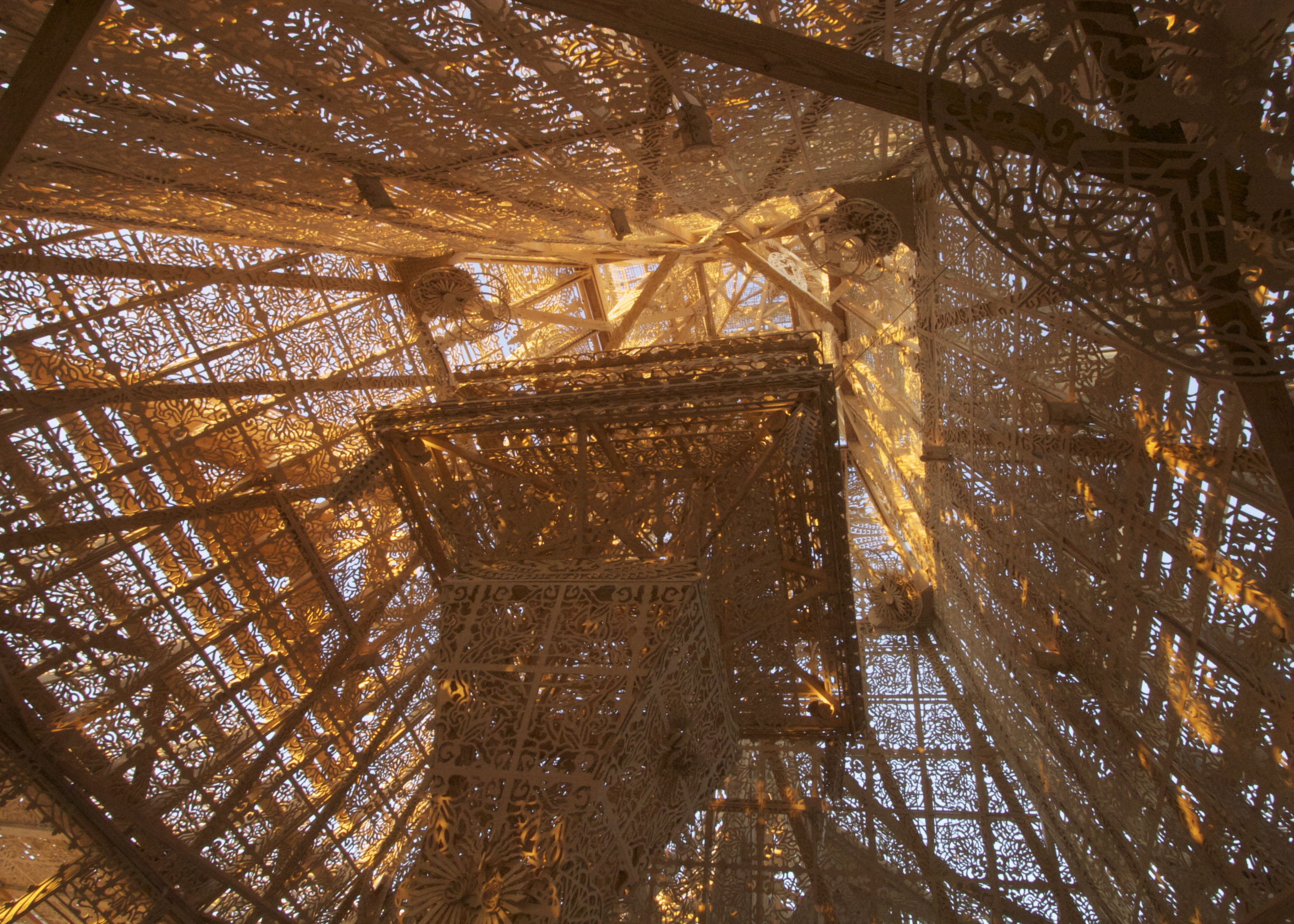 The original Bliss sculpture from Burning Man 2010 now resides on Treasure Island, San Francisco, where Marco has his studio. The statue weighs 7,000 pounds, is 97% air, and includes 55,000 welds, all done by hand. The internal framework is based on a geodesic structure (thank you Bucky Fuller), and includes 4500 ball joints. The “skin” consists of a steel mesh stretched over the structure and screwed on.