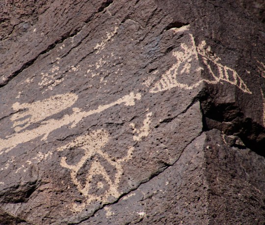 It is estimated that the majority of the petroglyphs were carved between 1300 and 1680 CE by ancestors of present day Pueblo people, but some of the petroglyphs have been dated back to over 2000 years ago. Many of the petroglyphs we found at the Monument are similar to others we’ve found throughout the Southwest. For example, does the following rock art look familiar?