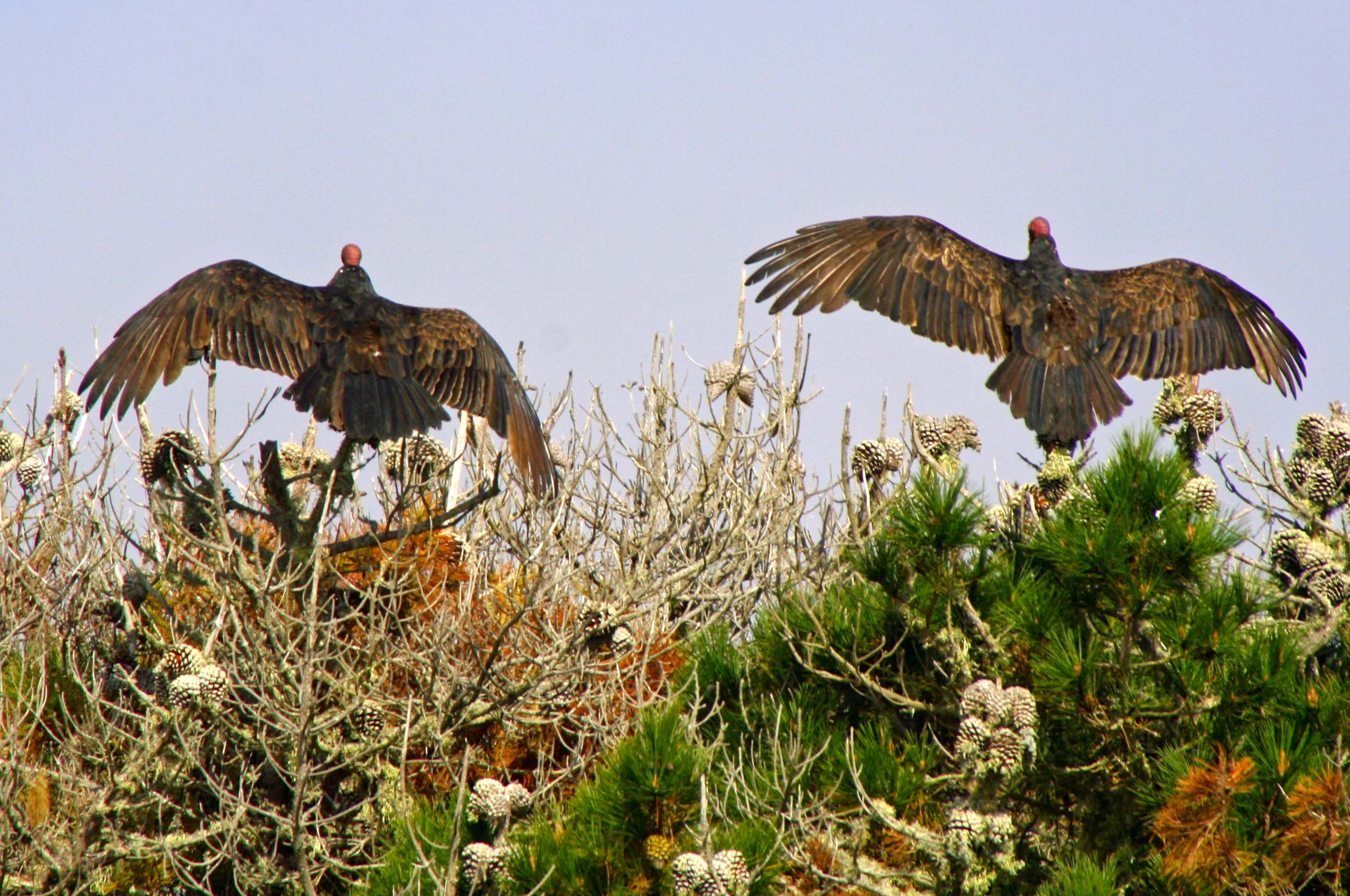 “Check out the buzzards,” Ken urged. A pair were perched on top of a pine tree drying out their wings from the morning’s fog in preparation for flight.