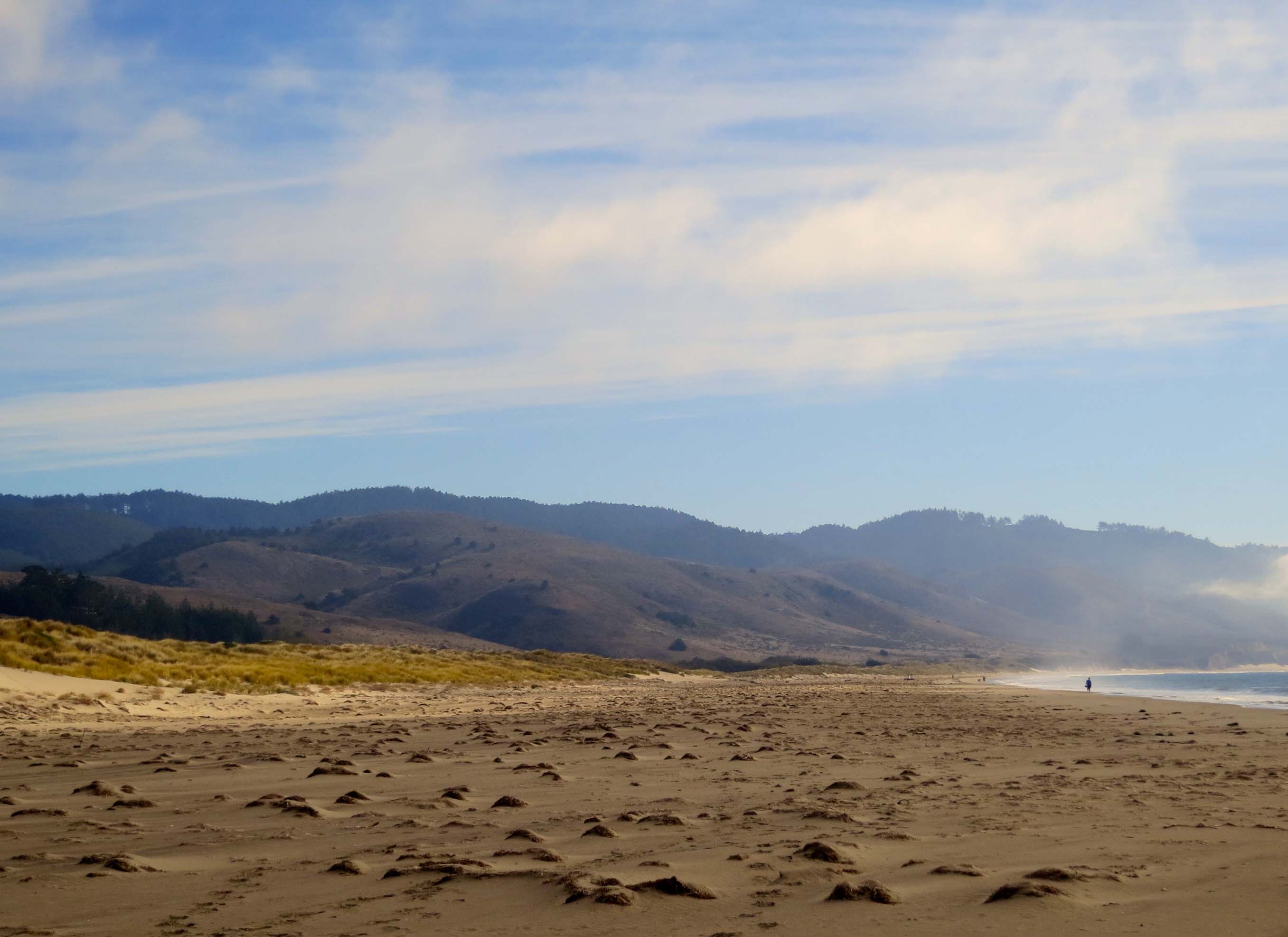 Looking north up Limantour Beach across Drakes Bay. Sir Francis Drake named the area Nova Albion, New England, probably because the sandstone cliffs reminded him of the Cliffs of Dover. (Photo by Peggy Mekemson.) The small mounds or sand dunes are created by plant matter.