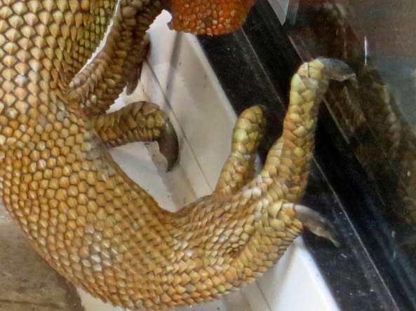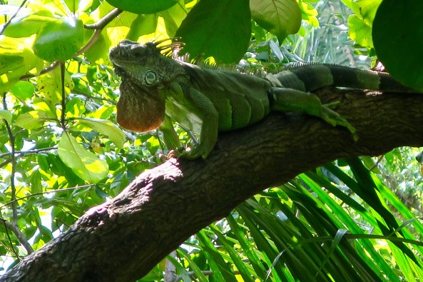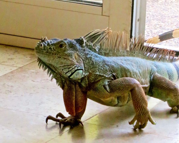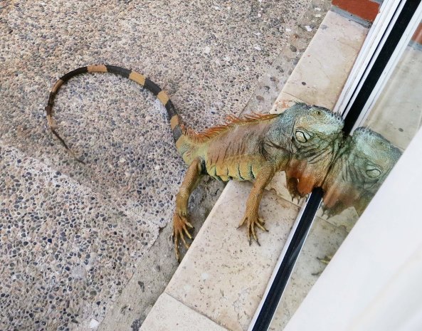 A couple of other interesting facts: One, they are great swimmers. They often jump from trees into water when a predator is after them. Two, they can jump from great heights without harm, up to 50 feet. It isn’t always a jump, however. When the temperature drops to 50° F or below, their bodies ‘freeze’ up and they come cashing down. Every once in a while when Florida suffers from a cold spell, headlines warn, “Watch out for falling iguanas.” They aren’t kidding.