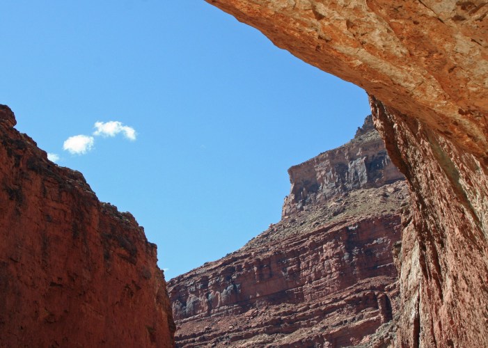 Tom is our boatman for the day. He checks to make sure our toenails are painted and then lets us board. The wind is still blowing but it has lost its ferocious bite. A mile down the river we pass Ten Mile Rock, a prominent landmark that has fallen from the cliffs above and now juts up out of the river. Made of Toroweap Sandstone, it was laid down in shallow seas that covered the area some 250 million years ago.