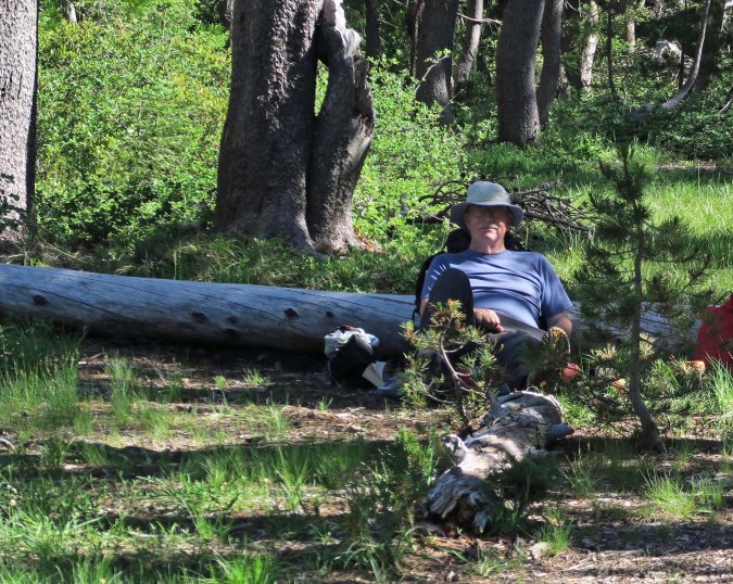 Azalea Lake is a jewel located in a basin surrounded by peaks and ringed by azaleas. Tall, incredibly straight lodgepole pines provided us with shade on our layover day as we hung out, snacked, read, and went for a hike around the lake, where we found a couple backpacking and carrying a tent, literally. Noisy chickarees (small tree squirrels) scolded us for our intrusion. As did the always vociferous Stellar jays. Quieter birds such as robins, Juncos, and fly catchers merely went about their business of scrounging for food as the sun made its way across the sky. A Pileated Woodpecker caught our attention with a more stentorian call.