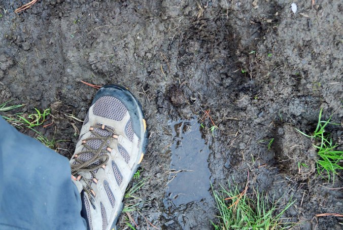 I found myself getting excited. Had I discovered a track of Bigfoot’s big foot?! I rested my boot alongside the track. I have big feet myself, size 14 American (49 European). The track was seven inches longer, over 20 inches long (50.8 centimeters)! I did a more thorough search for other tracks. A more expert tracker may have found something, but I didn’t. My thought was the creature who made the track was bipedal and running. It had traveled from the dry ground to the marshy area and back to the dry ground.