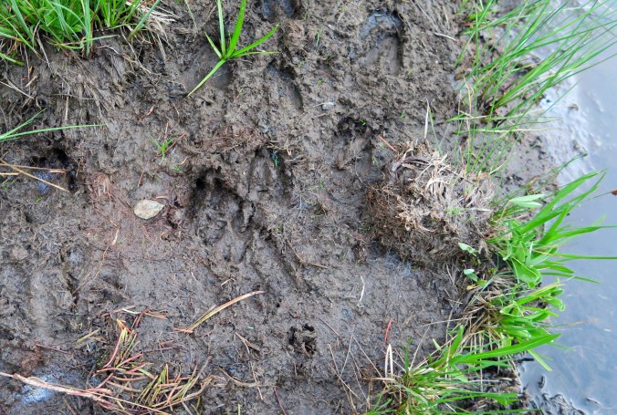 A large track caught my attention and I stopped to check it out. Something heavy had landed and launched on the spot, apparently in a hurry. A huge bear was my first thought since the depression was a good two inches deep. The deer tracks were closer to a half-inch and bent grass was all I was leaving. I looked around nervously. But something wasn’t right.