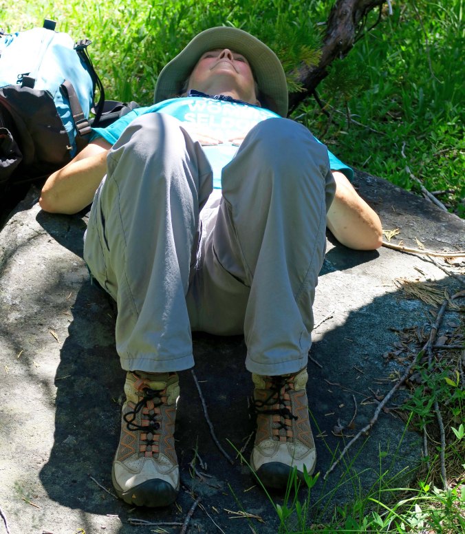 Red cedars replaced the pines as we continued our climb through the dry forest, while cheerful tiger lilies and other flowers brightened our way whenever we crossed a stream. Eventually we arrived at Red Cedar Basin. Peggy zonked out on a flat rock while I wandered around the meadow, which was filled with corn lilies. Had there been water, it would have become camp. But Azalea Lake beckoned. We dutifully shouldered our packs and completed the trip. We found an attractive campsite and settled in for the afternoon and next day. Numerous insects greeted our arrival and some came by to take blood donations. By seven PM, Peggy had disappeared into the tent. She’s been known to disappear inside at the buzz of the first mosquito— leaving me outside to entertain our flying and crawling visitors.