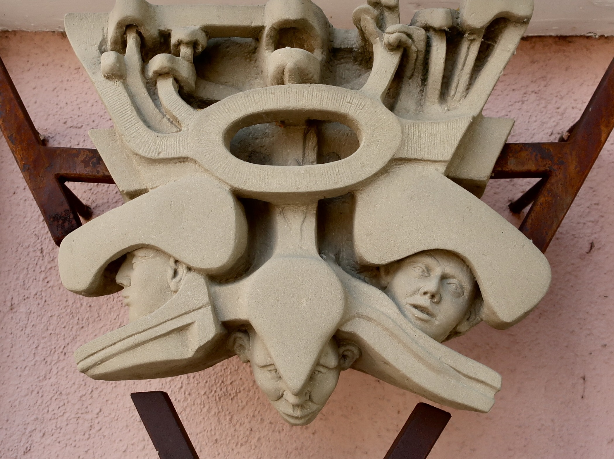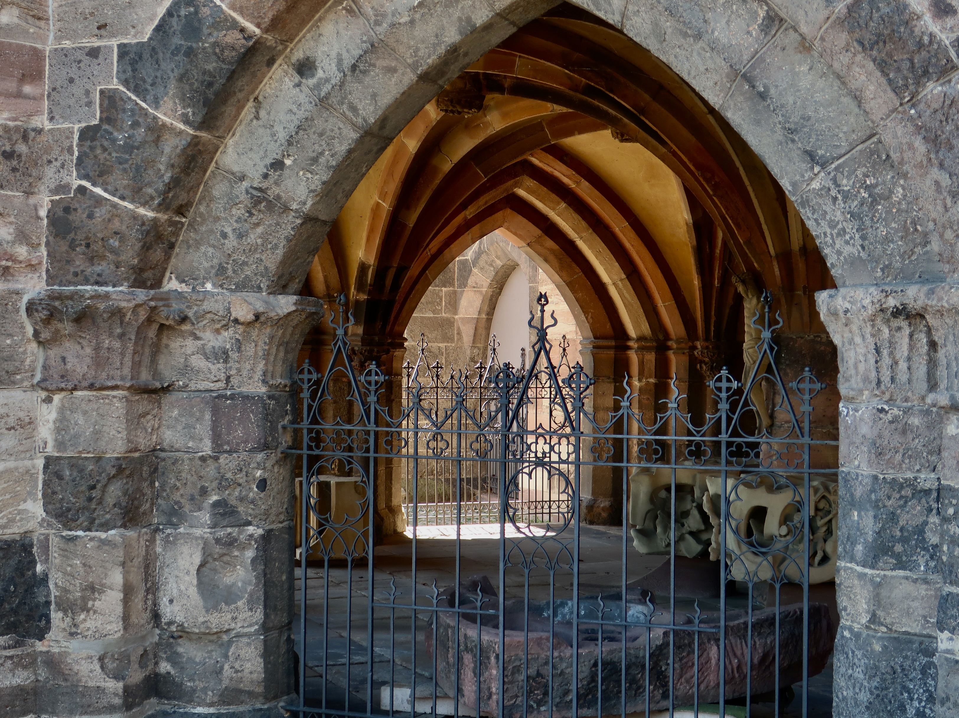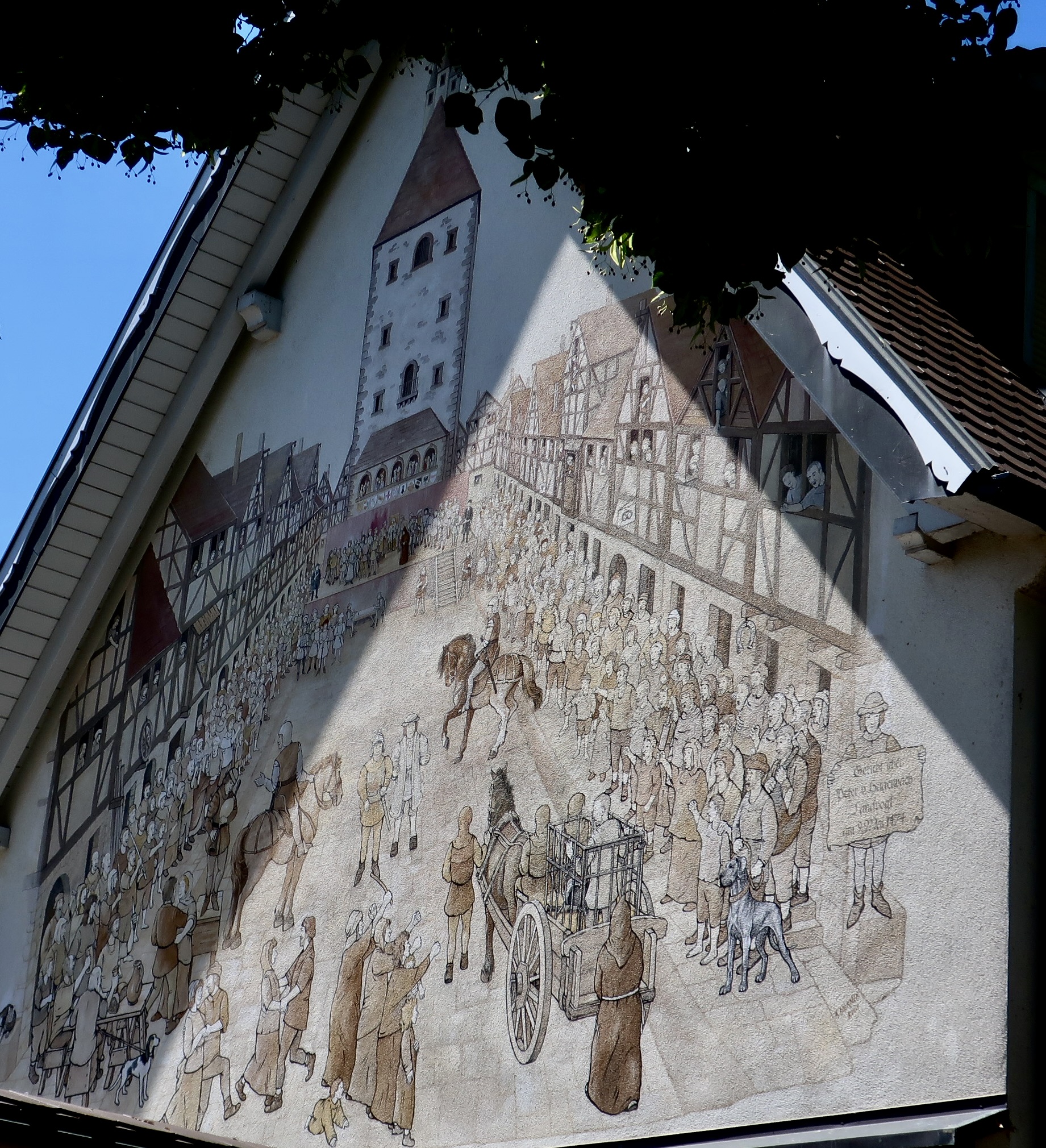 A photo from Wikimedia Commons of Breisach being attacked by Allied forces in 1942. St. Stephen’s Cathedral is burning at the top right side of the picture. 85% of the town was destroyed by Allied artillery.Peggy and I went for a walk into Breisach to visit St. Stephen’s Cathedral. This is a view looking up from the town. Obviously, the cathedral, like the town, has been rebuilt since WW II.Our trip up to the Cathedral took us through Gutgesell Gate. Built in 1402, it was destroyed in WW II and has since been rebuilt. A sign on the side noted that Pope Johannes was arrested here in 1415. It was a time when three people were claiming to be Pope. The ‘official’ church position out of Rome was that Johannes was an antipope. It’s bad for business to have more than one Pope. It tends to confuse the flock and worse— split the donations.The steep walk up to the Cathedral past brightly painted houses was worth it on its own.Flower boxes added to the color.Toward the top, the road narrowed to a walking path. I found this old doorway and couldn’t help but wonder what treasures (or ghosts) might be found behind it.An intriguing coat of arms was found above the doorway.The view of St. Stephen’s that greeted us as we finished our hike up the path. Construction of the church started in the early 12th Century.We walked around the church admiring it from various perspectives.These pockmarks on the side of the Cathedral caught our attention. I wondered if they had been left from the artillery attack during WW II. Turns out that they were from an earlier bombardment from 1870. Apparently the church has a problem with avoiding the line of fire.This chamber challenged our imagination. First there was the fence with what looked like a cat sitting on top, which I found amusing. Then there was the strange sculpture inside…The stone mason makes sense. St. Stephans was the patron saint of stone masons. But what about the strange figure on the right? The dark side of medieval Christianity was, uh, dark.For example, the door to the Cathedral featured St. Stephens being stoned.The hill on which the church sits, gave us great views down into Breisach, as was shown in the first photo and this one.And then there was the bull emerging from the bricks……with a naked lady standing on top.