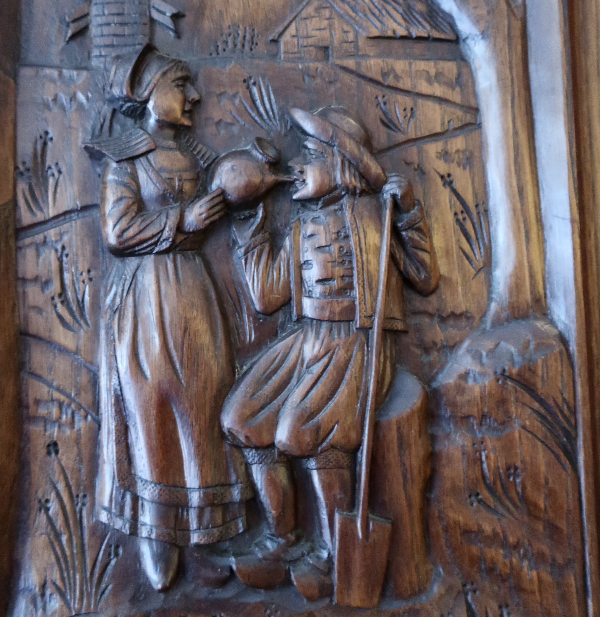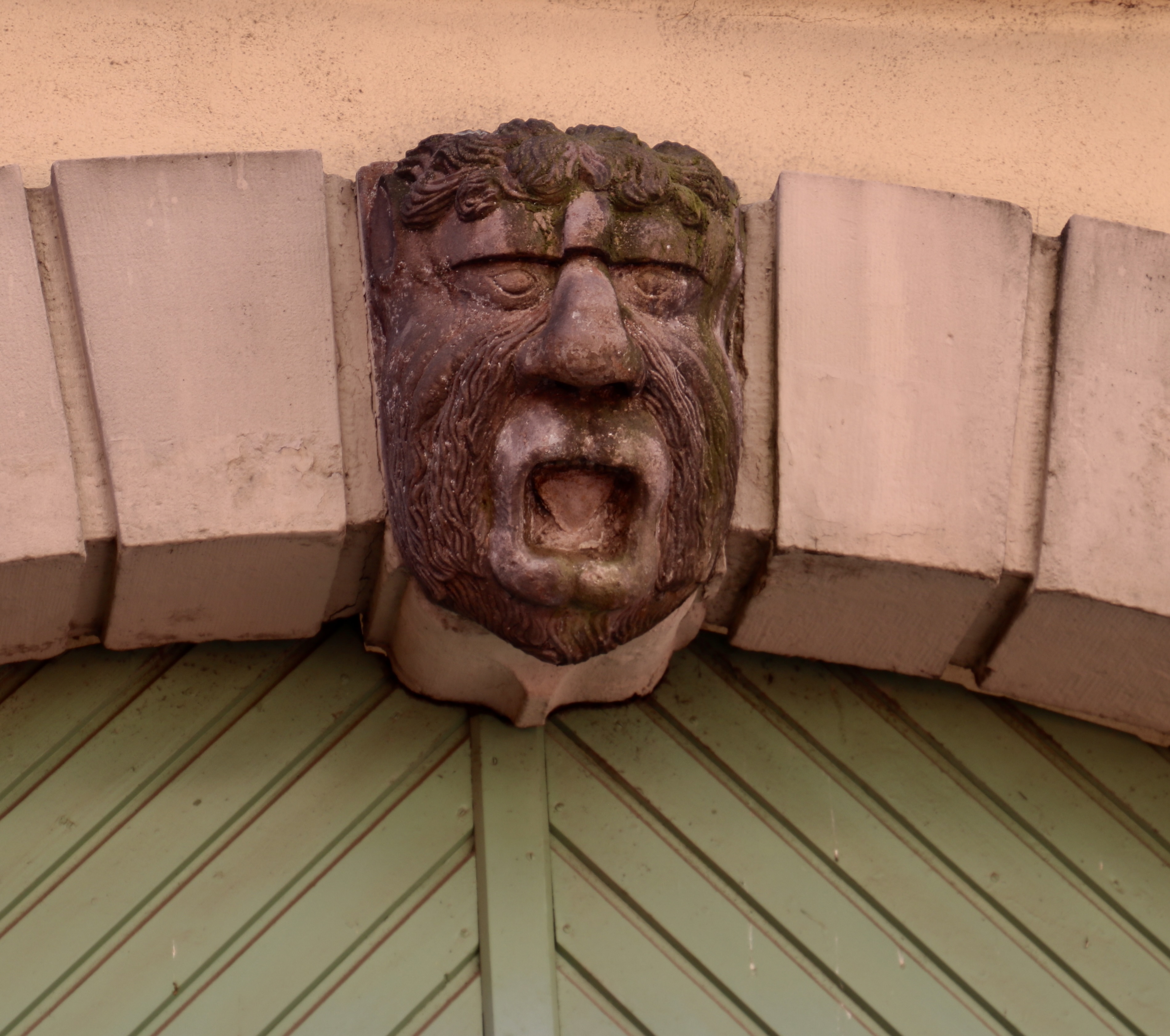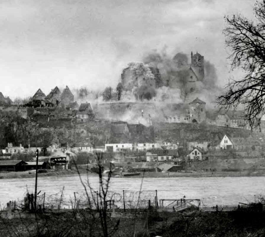 A photo from Wikimedia Commons of Breisach being attacked by Allied forces in 1942. St. Stephen’s Cathedral is burning at the top right side of the picture. 85% of the town was destroyed by Allied artillery.Peggy and I went for a walk into Breisach to visit St. Stephen’s Cathedral. This is a view looking up from the town. Obviously, the cathedral, like the town, has been rebuilt since WW II.Our trip up to the Cathedral took us through Gutgesell Gate. Built in 1402, it was destroyed in WW II and has since been rebuilt. A sign on the side noted that Pope Johannes was arrested here in 1415. It was a time when three people were claiming to be Pope. The ‘official’ church position out of Rome was that Johannes was an antipope. It’s bad for business to have more than one Pope. It tends to confuse the flock and worse— split the donations.The steep walk up to the Cathedral past brightly painted houses was worth it on its own.Flower boxes added to the color.Toward the top, the road narrowed to a walking path. I found this old doorway and couldn’t help but wonder what treasures (or ghosts) might be found behind it.An intriguing coat of arms was found above the doorway.The view of St. Stephen’s that greeted us as we finished our hike up the path. Construction of the church started in the early 12th Century.We walked around the church admiring it from various perspectives.These pockmarks on the side of the Cathedral caught our attention. I wondered if they had been left from the artillery attack during WW II. Turns out that they were from an earlier bombardment from 1870. Apparently the church has a problem with avoiding the line of fire.This chamber challenged our imagination. First there was the fence with what looked like a cat sitting on top, which I found amusing. Then there was the strange sculpture inside…The stone mason makes sense. St. Stephans was the patron saint of stone masons. But what about the strange figure on the right? The dark side of medieval Christianity was, uh, dark.For example, the door to the Cathedral featured St. Stephens being stoned.The hill on which the church sits, gave us great views down into Breisach, as was shown in the first photo and this one.And then there was the bull emerging from the bricks……with a naked lady standing on top.