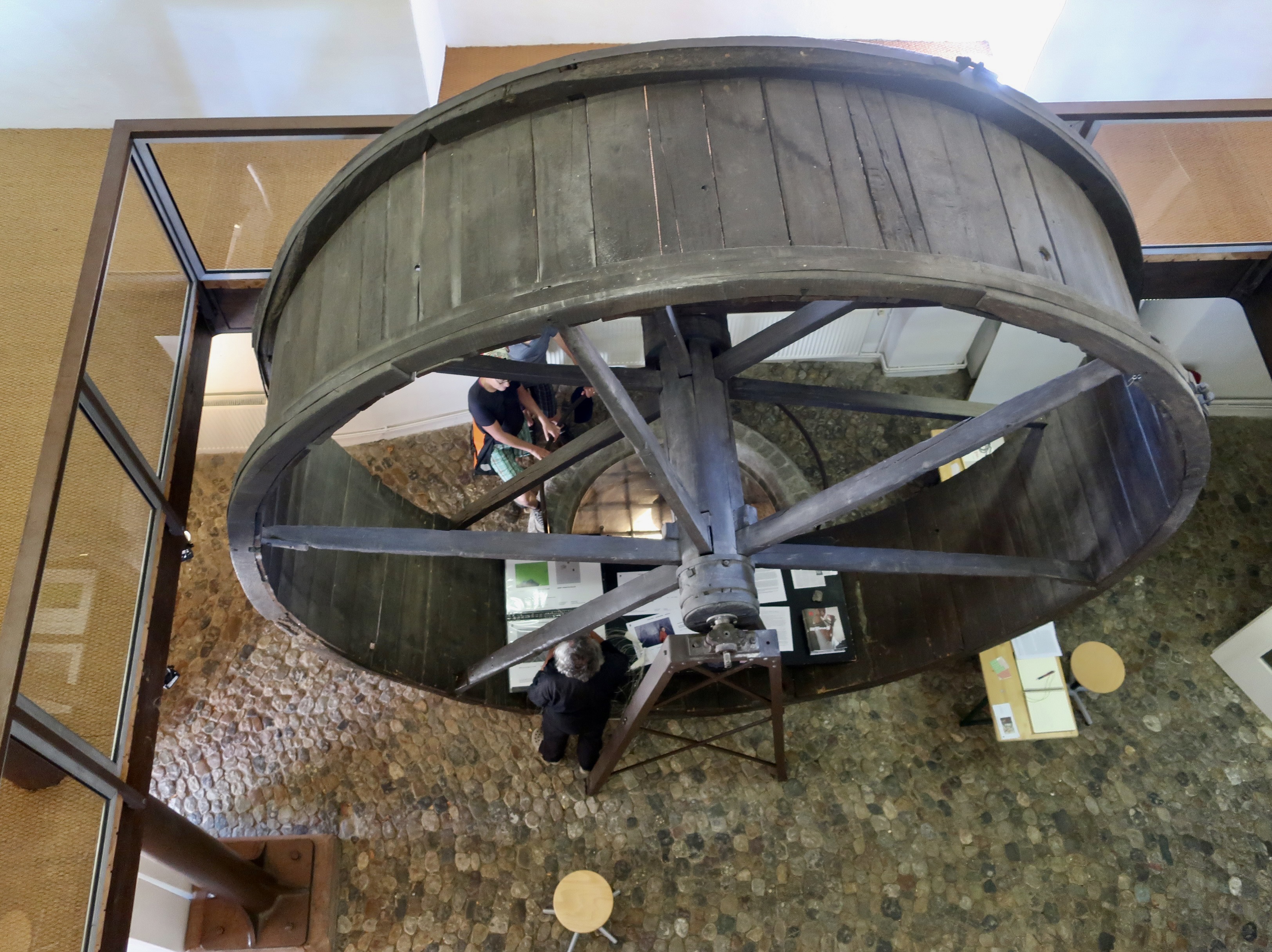 This scupture had me scratching my head, but I figured it would make an excellent home for a bird, or possibly a raccoon. Remember Mad Magazine and Alfred E. Neumann, the guy who always graced its covers? Now check out the dude on the bottom of the sculpture. I’m betting that the artist had a sense of humor. This impressive sculpture of a water wheel/clock represents what is inside of the building it is attached to…This is what the outside of the Water Wheel building looks like.We found this fellow outside of the building. He seemed to be having a bad day. Possibly he had been a bad boy and was contemplating his fate inside…A mural showed a prisoner being taken to the Water Wheel Building. It was used as both a prison and a torture chamber. Or, a prisoner might be assigned to operate the dreaded water wheel. Note the people screaming at the prisoner while others danced in the streets. It spoke to the times.The huge water wheel located inside the building. The stools and the person sitting on the other side of wheel provide perspective. I’m not sure how the wheel was operated but human hamsters come to mind. The well is located beneath the wheel. But enough on dark images and thoughts, I conclude today’s post with another windowsill flower garden in Breisach, and… Our riverboat, the River Empress, that was docked on the Rhine in Breisach. Next Monday, Peggy and I will return to our fall trip around the US. This time we will be in Custer State Park in South Dakota where the buffalo block traffic and the donkeys are bandits.