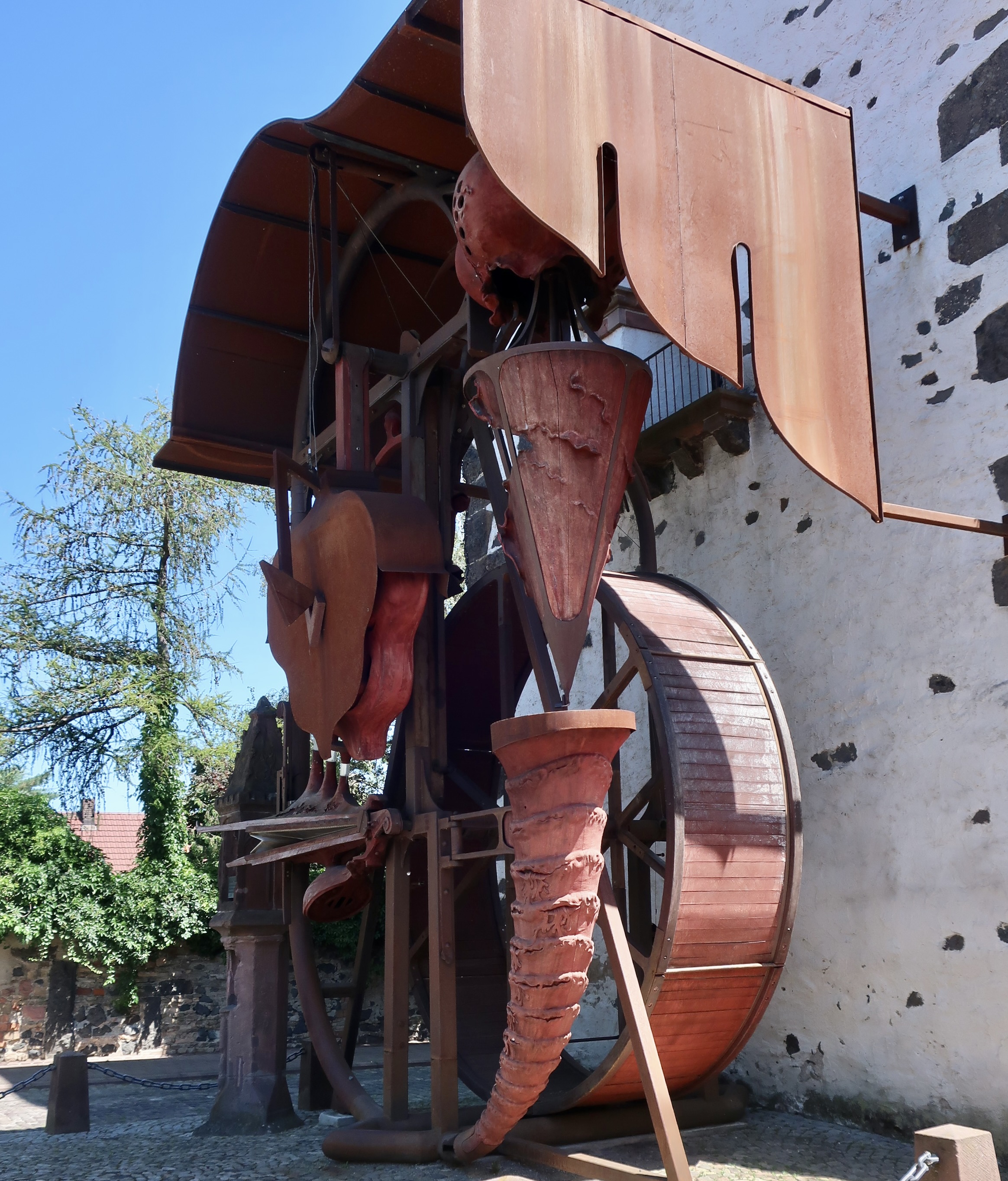 The tower on the left was where we were standing when the photo above was taken. The narrow steel stairway was the way up. Another view of the tower, the stairway, and the hanging basket.Here’s a closeup of the basket. It was used as a fire basket signal that could be seen from nearby castles and repeated. I also read that it could be used as a prime location for placing people who refused to pay their toll, so they could contemplate the folly of their action. This photo provides a perspective on the promontory that Rheinstein is built. One has the feeling that attacking from the front would be a bit daunting.The grapevine is the focus here. Information on Rheinstein claims that it is 500 years old and still producing viable grapes for burgundy! Talk about well-aged wine… Grin.A side view of the back of the castle.Working our way around to the back.The view from behind.We were also attracted to this photogenic tower.A view of the Rhine from the castle. A barge, riverboat and another barge can be seen working their way along the river. Fortunately, tolls are no longer an issue. Trade increased exponentially when they were eliminated in 1831. And now, it’s time to enter the castle.I’d like to report that the restrooms had at least been modernized. Hanging over the edge and letting go was no longer a requirement or an option. Rooms had been tastefully decorated with antique furniture and flowers from the castle’s gardens. Note the harp in the corner. More later.What castle would be complete without the dress of a princess on display? Light here was provided courtesy of stained glass windows. There are several in the castle.As might be expected, faith was a common theme.Demonstrating your faith was an important prerequisite for getting through the Pearly Gate. Maybe the rules change once you are admitted. Not to harp on the subject, but I think this may be a more modern perspective.Not a stained glass window! Tasha and Peggy as seen through glass that was obviously older than their combined age and then some.This charging knight was carved into a chest. One wonders how fast the short legged horse could charge.There was a great variety to the art. This modern version of the castle reminded me of an El Greco painting.Maintaining the property would have been hot, hard work in the 1300s. A worker receives a welcome drink of water. Or maybe it was burgundy from the grapevines. I wouldn’t want to encounter this fellow on a dark night. Or make that any time. He is not a boring boar.A possible comment on my attempts at punning.Dare I say something about spouting off…Coming from the western United States, I am familiar with hunters mounting the heads of the huge trophy animals they have shot on their walls as proof of their manly manliness. Believe me, when I say they would not mount these tiny fellows that are about fist size, unless, of course, they were extremely rare. Not sure what they are except an extremely small species of deer. Do you find them as weird as I did?I’ll finish with this photo of the flag over Rheinstein Castle. May it continue to fly for another 700 years. Next up, we move away from castles for other views along the Romantic Rhine. (Or maybe, I’ll do a post on Devil’s Tower in Wyoming for variety. I just finished processing the photos.)