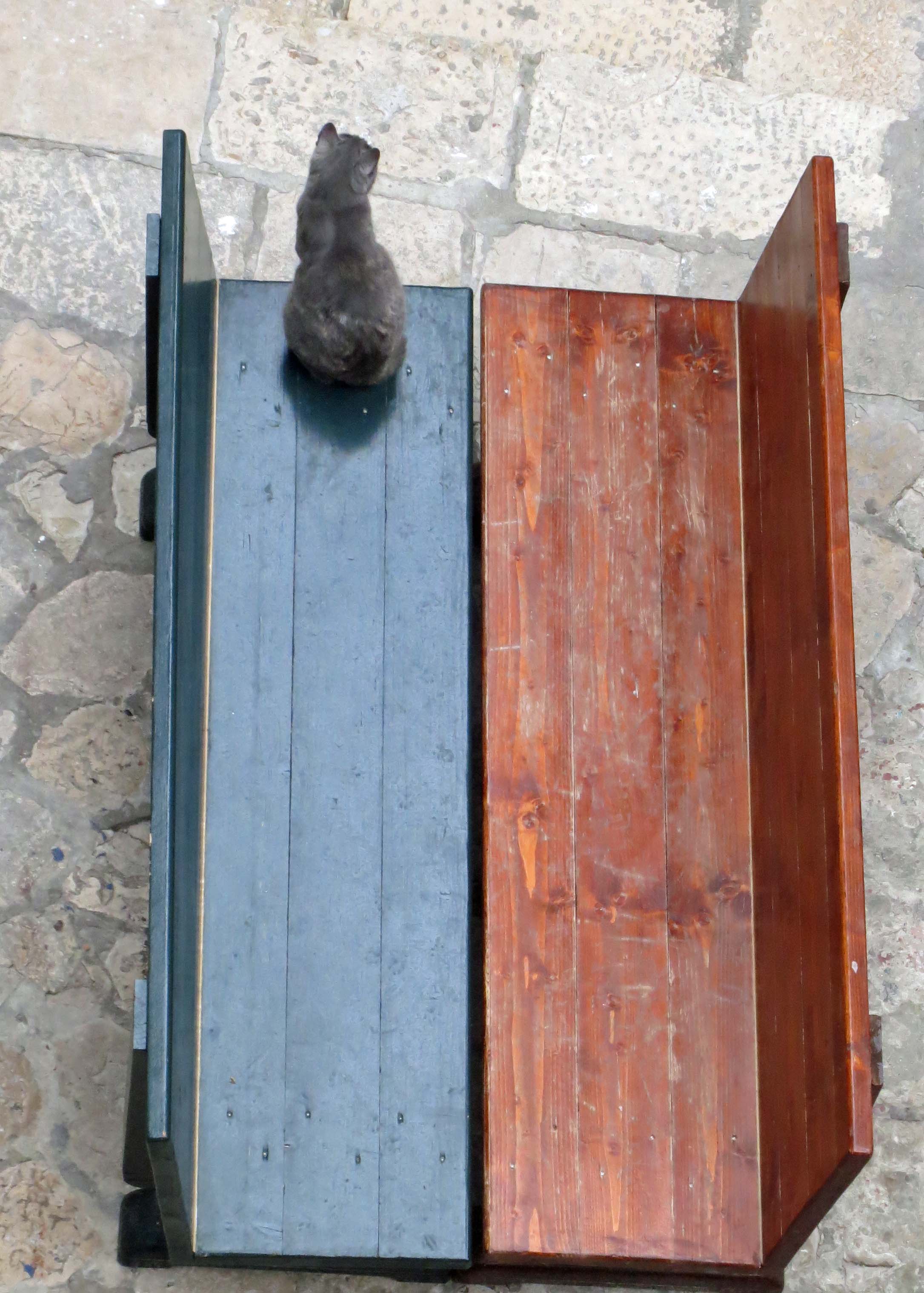 My obligatory cat photo from Dubrovnik. I loved the contrast between the cat and the two benches that had been shoved together.