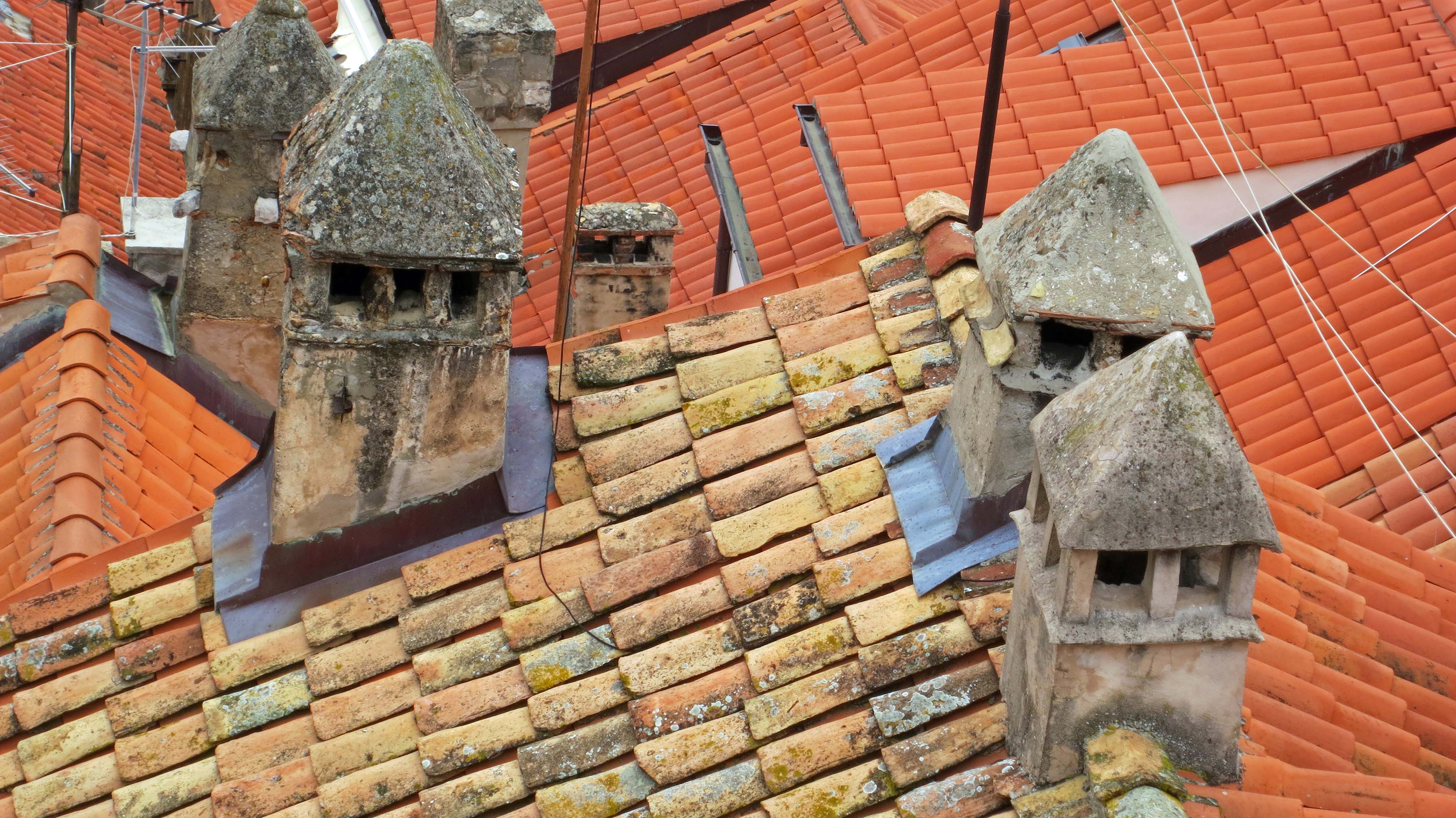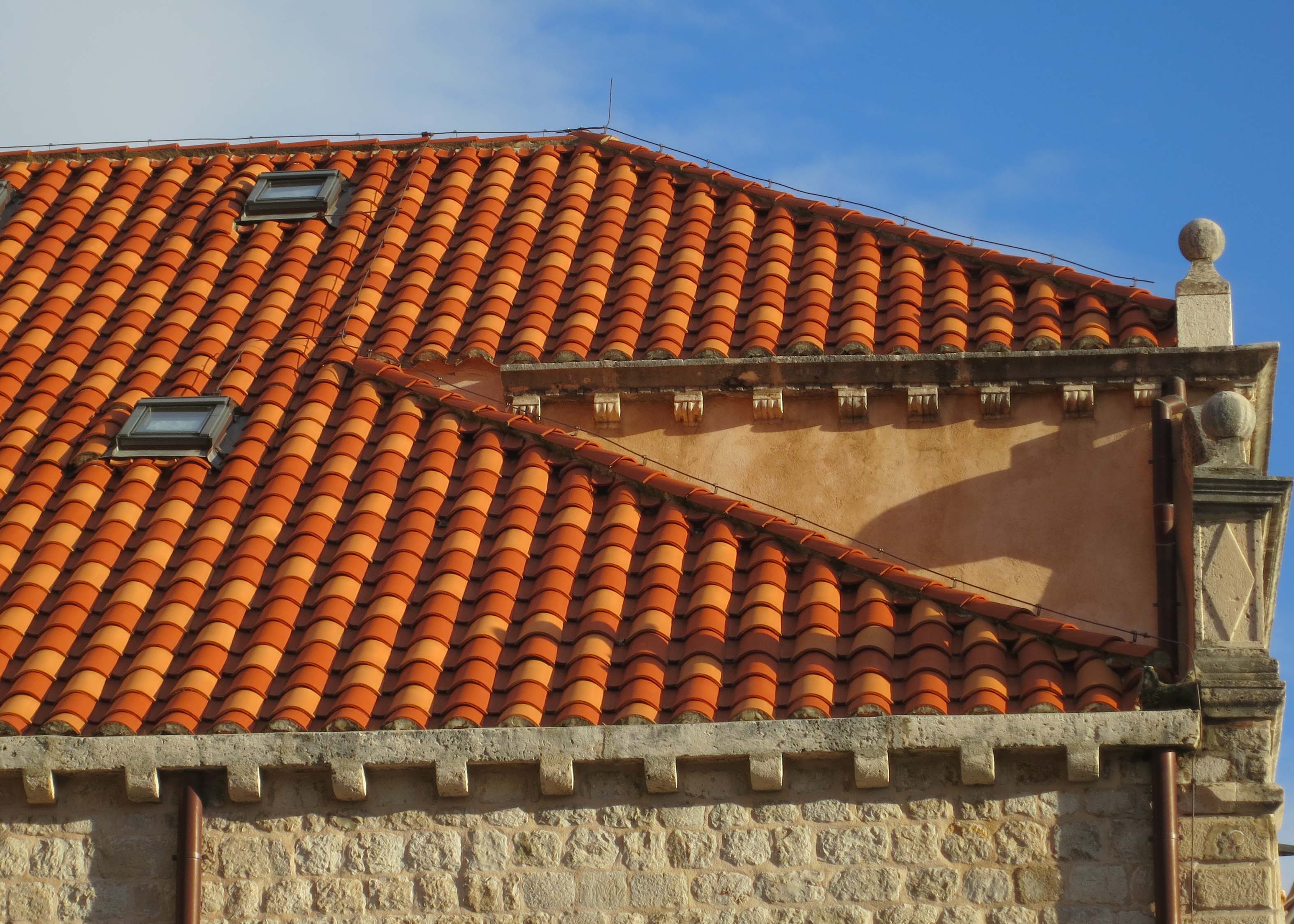 Another view of old and newer tiles in Dubrovnik. This one features chimneys.