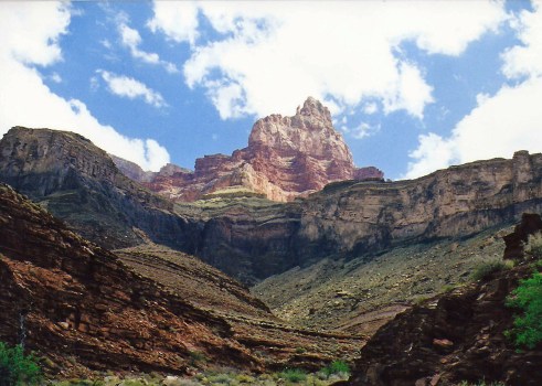 Somewhere between two and three miles down I came upon the gentle lower slopes of the Escalante and Cardenas Buttes, which allowed me to lollygag along and enjoy the scenery. I escaped from the sun beneath the shadow of a large rock, drank some of my precious water, nibbled on trail food, and took a brief nap. It would have made a good place to camp. Others had obviously taken advantage of the shade and flat surface, but the Colorado River was calling.