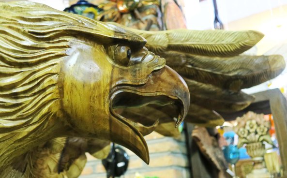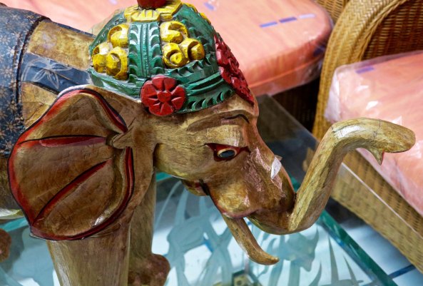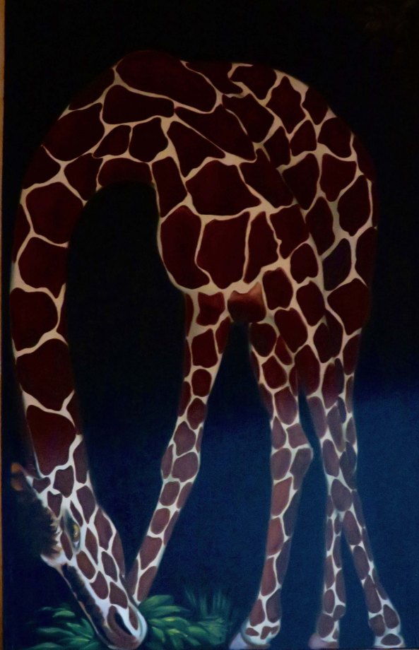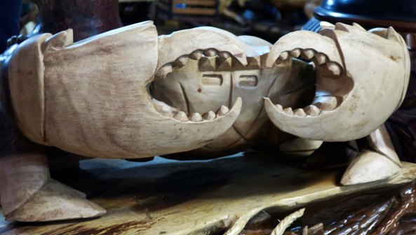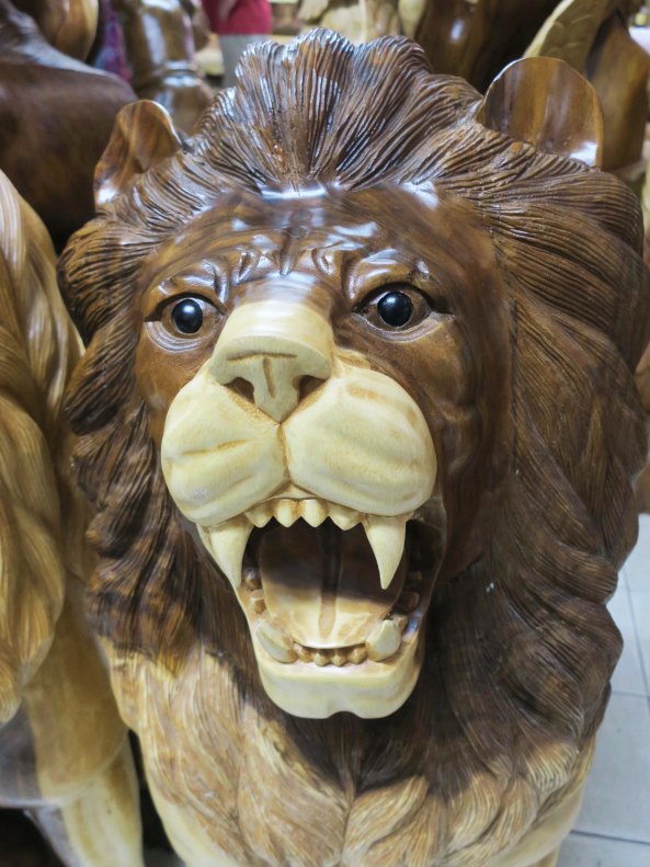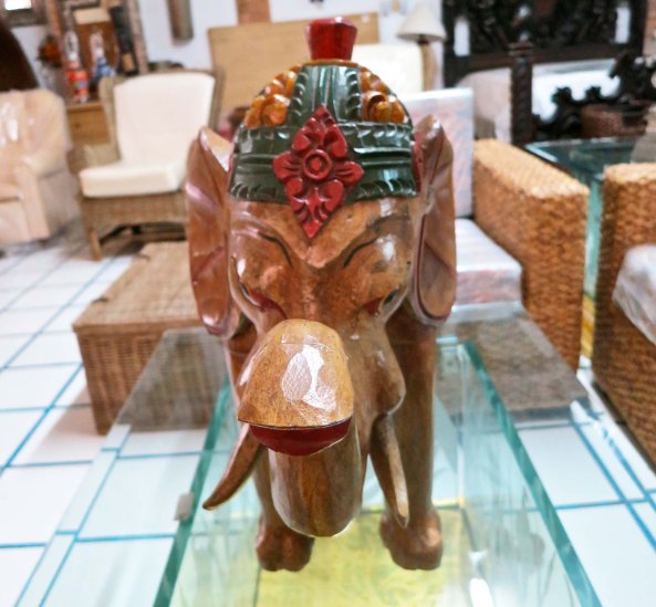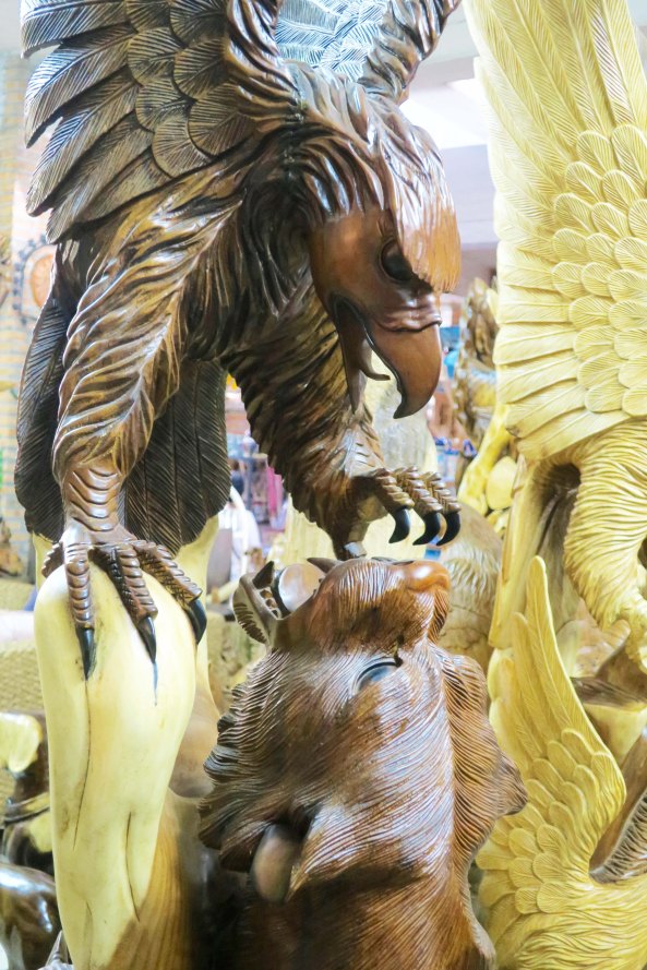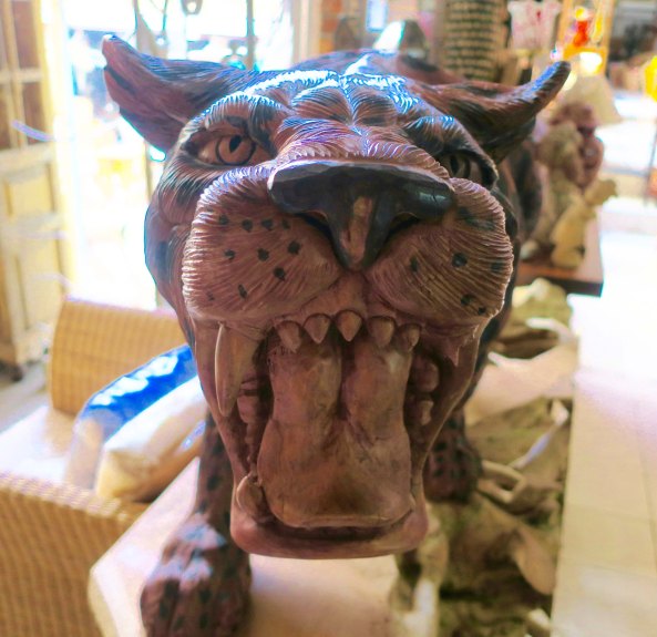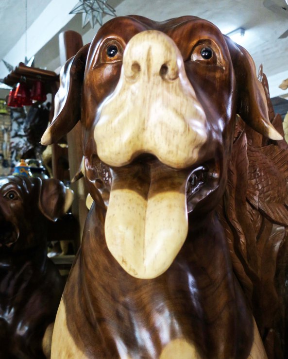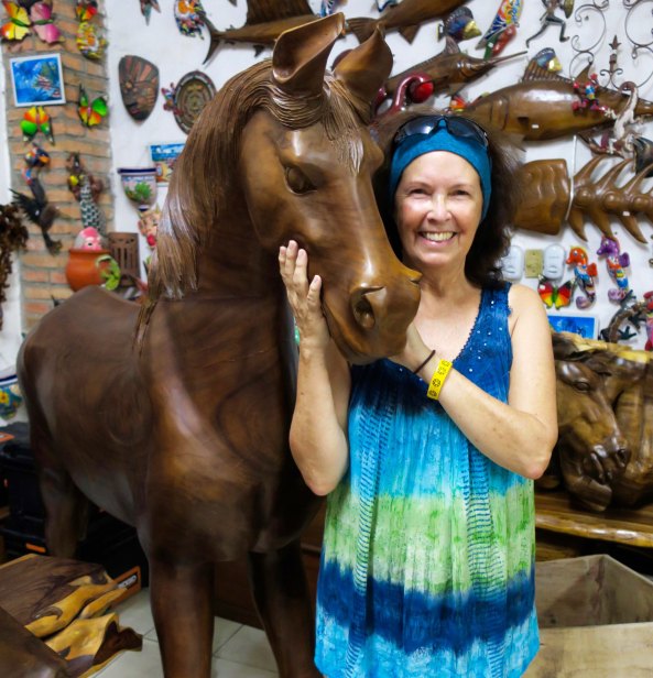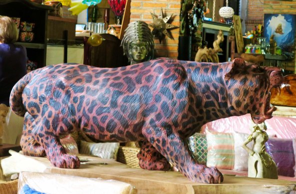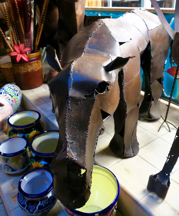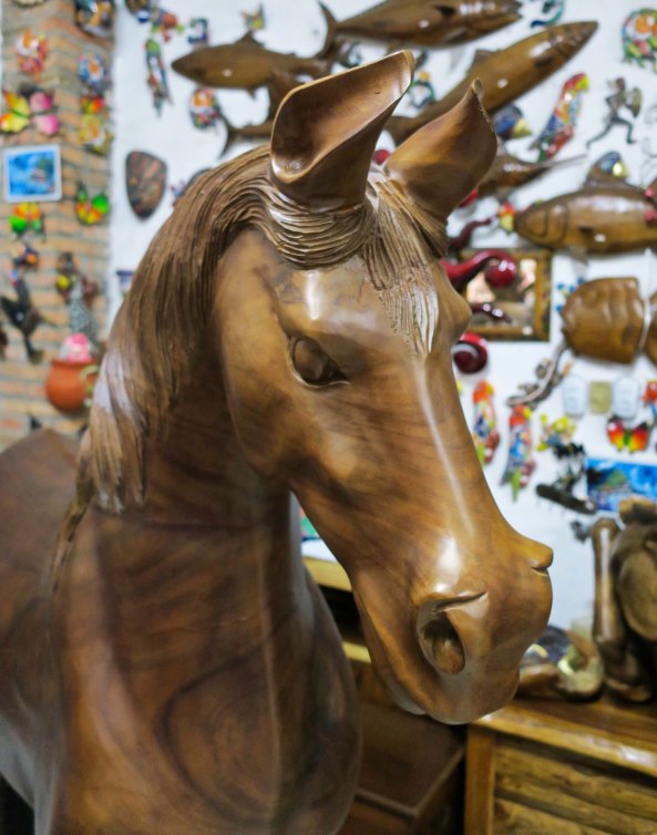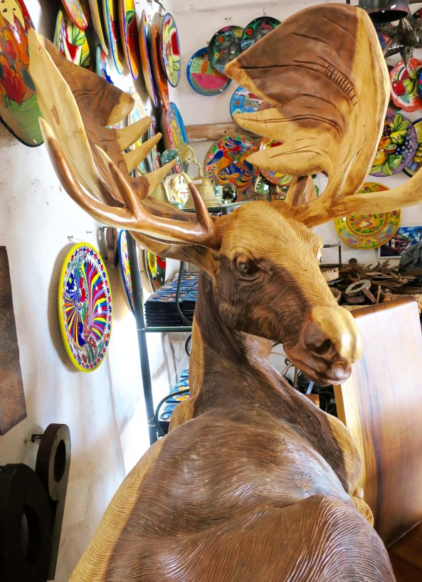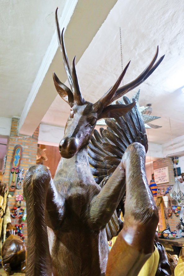A ferocious jaguar stalking across the floor.With big teeth.A friendly dog…That Peggy pets.A toothy lion.An eagle and a jaguar have a discussion about which is most ferocious.Given this eagle, I’d say a toss-up.A realistic carved horse…That Peggy befriends.Puerto Vallarta’s favorite lizard: The iguana. I’ll be doing a post on these big fellows.Head shot!A turbaned elephant…A trumpeting trunk.A crabby crab.A fighting stag displays its hooves.I’ll conclude my exploration of the Furniture Mart today with this striking painting of a giraffe. Next up on the Mart will be ceramics ranging from pigs to plates.