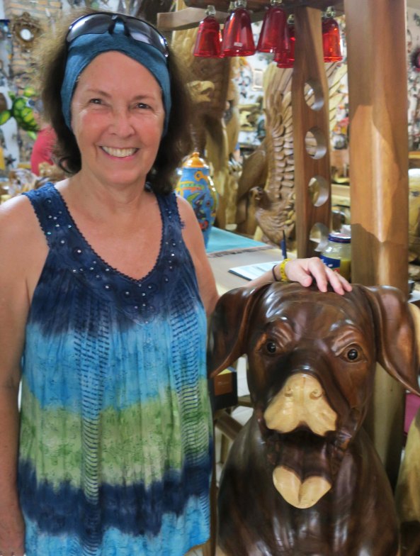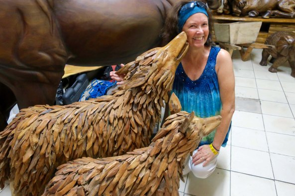 A friendly wolf licks Peggy’s face at the Furniture Mart in Puerto Vallarta.
