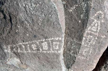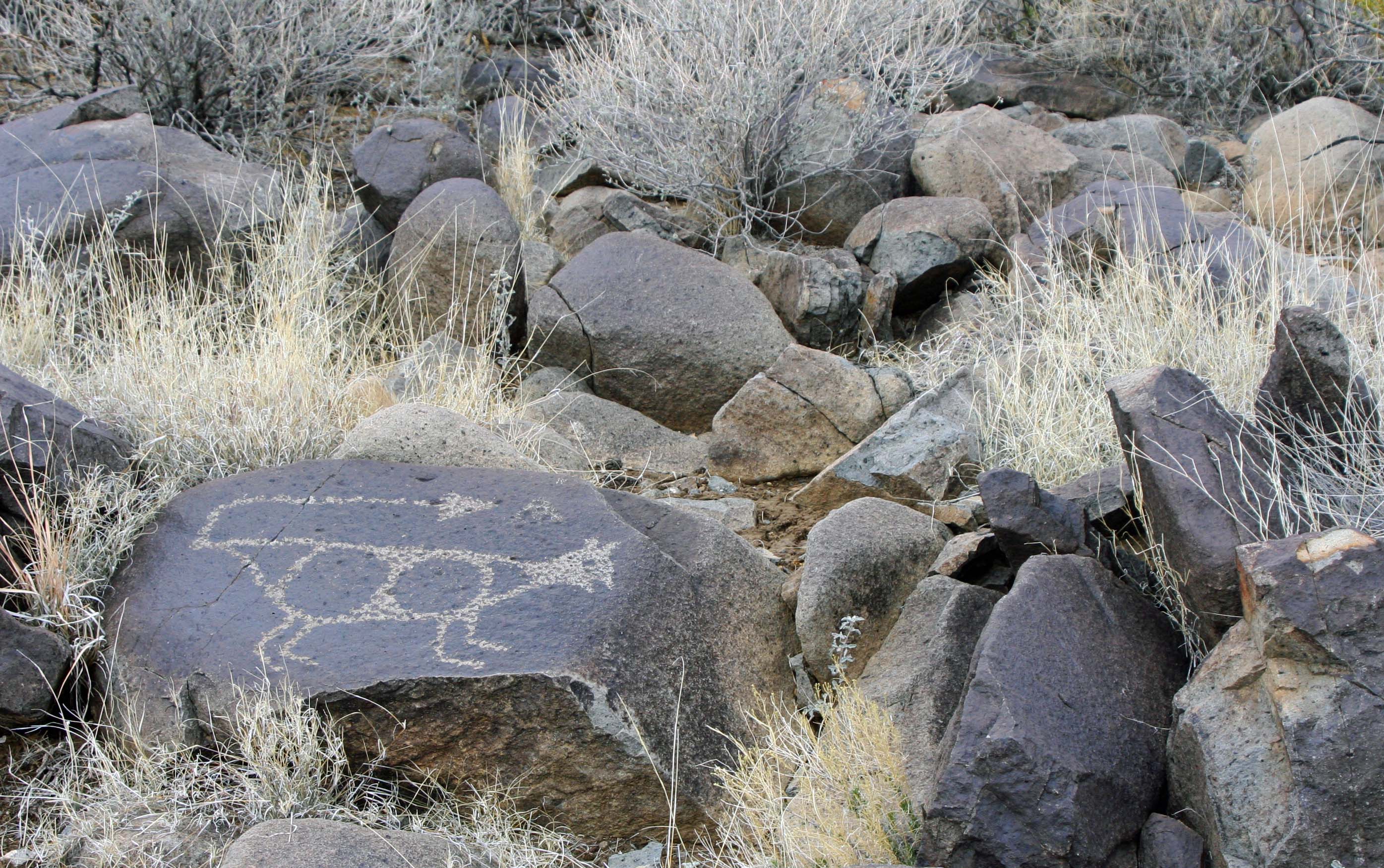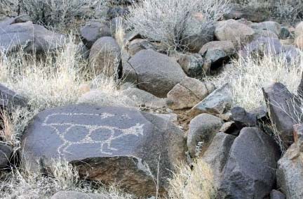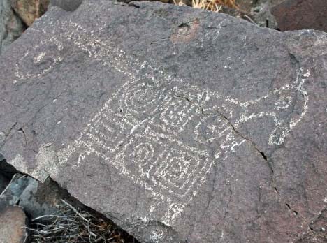 Geometrical forms are often found in rock art, and the Three Rivers Petroglyph Site is no exception. The body of this horse with its ears back and tail sticking out is filled with squares. I’m wondering if its pose is a result of eating Datura, whose seed are represented by the two circles. Or maybe it just spotted the horse-sized snake off to the right. My ears would be back and tail sticking out too.