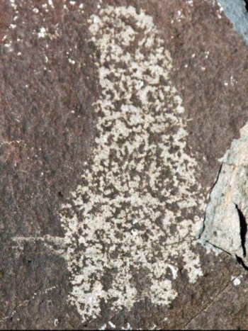 Lacking the geometric look of the above petroglyphs, this may be a ladder leading down to a map of personal crop sites. Many Native Americans lived in cliff dwellings and would travel by ladder to farms below. I wonder if the footprint isn’t saying ‘walk this way.’