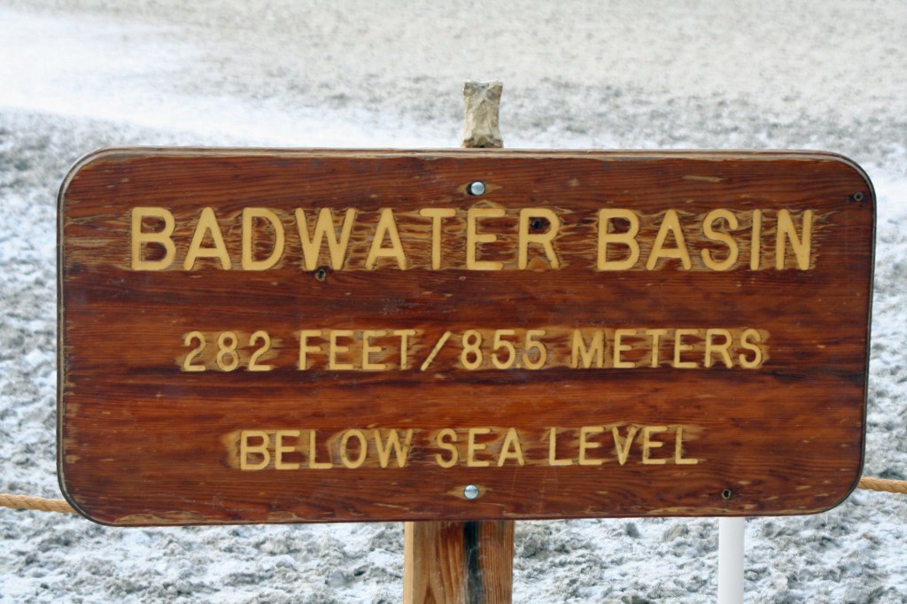 And finally, the lowest. At its lowest point, Death Valley is 282 feet below sea level, which just happens to be the lowest spot in North America. On an earlier trip, Bone was proud to pose on the Bad Water Basin Sign announcing the low point.